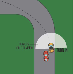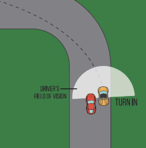 This image shows at the lead car’s turn in point the overtaking car has yet to get even with the A pillar and into the peripheral vision of the lead car. The overtaking car is in a blind spot. Do not pass unless the lead car is much slower and gives racing room.