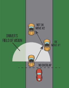 Should the lead car decide to ‘go with him/her/them’, side-by-side, then both cars must allow each other racing room, at least a car width plus six inches or so, to the edges of the racing surface. In both cases, the trailing car must be in the lead car’s peripheral vision to safely hold position. If not in vision, then the trailing car must back off and follow, because the lead car cannot see it.