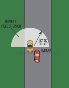 The overtaking car (the car attempting a pass) must get into the peripheral vision of the lead car (the car being passed) in the brake zone before the lead car turns for the corner. Once the lead car turns for the corner, it can no longer see the trailing car, because the lead car’s mirrors now point outside, and the lead car is looking toward the apex.